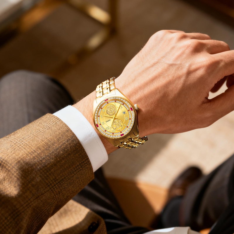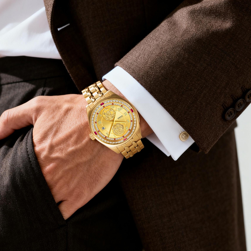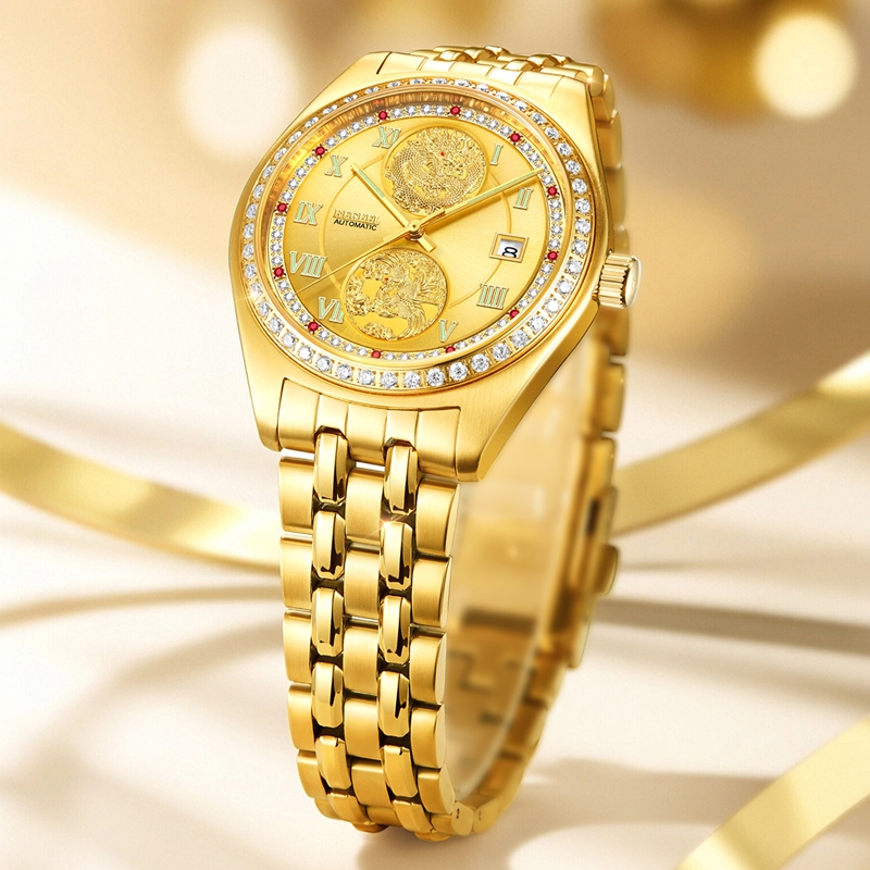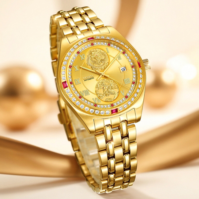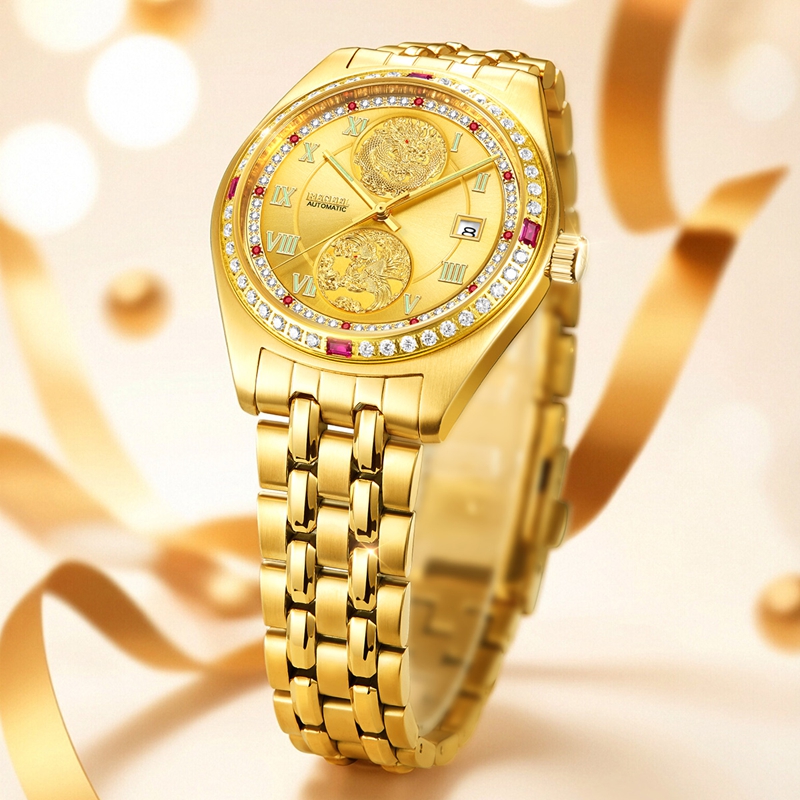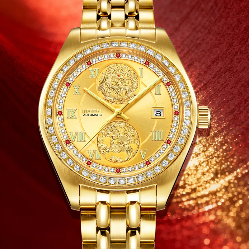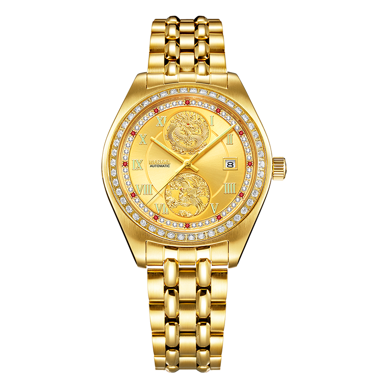 字面:2颗真红宝石,10颗合成红宝石,48颗晶钻,浮雕龙凤,太阳纹,罗马刻度钉,夜光指针