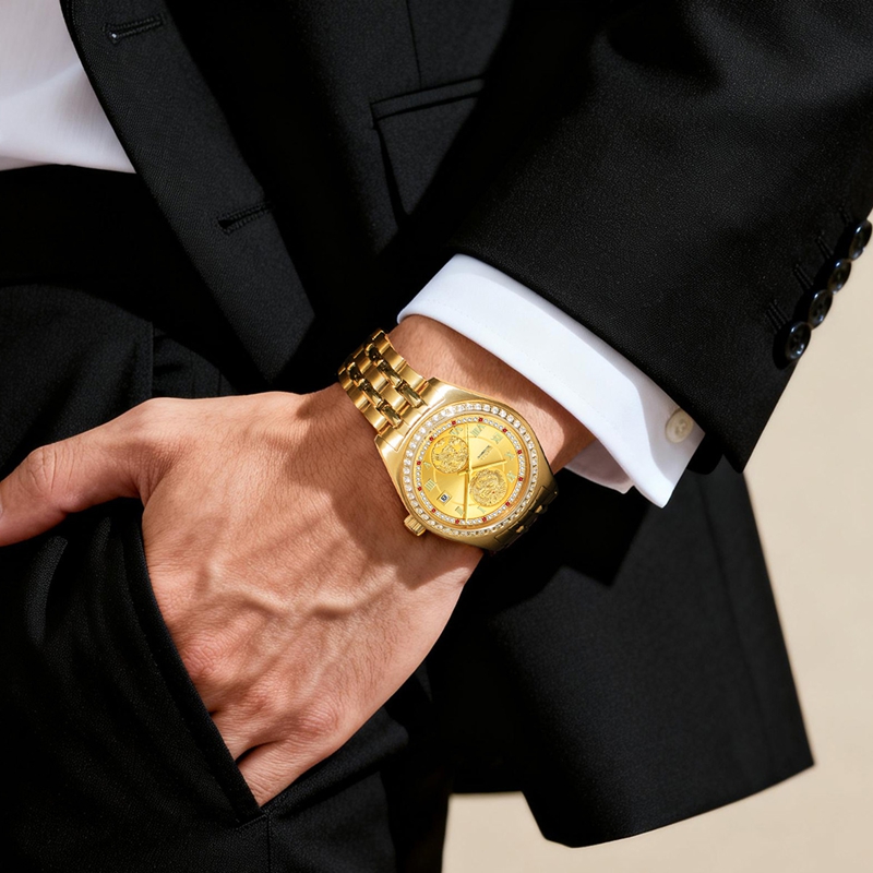 表壳:316L精钢电镀真金,白圈口镶嵌46颗晶钻;红圈口镶40颗晶钻,4颗红方晶钻